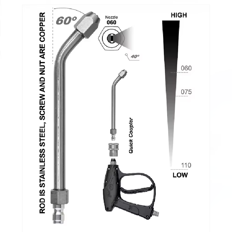 El diseño de tamaño de esta boquilla doblada es preciso, doblado de 60 grados, con el diseño de la diámetro de salida de 060 grados, este diseño especial de esquina puede alcanzar fácilmente el espacio interno estrecho del aire acondicionado para la limpieza. La operación puede ser muy flexible. La especificación de la boquilla es 060, y el ángulo de la boquilla es de 40 grados, por lo que puede formar un flujo de agua apropiado para enjuagarse en la operación de limpieza. Nilfisk y WAP son marcas muy famosas de equipos de limpieza. Estas dos marcas de pistola de lavado tienen un flujo de agua de alta presión estable y pueden controlar con precisión la limpieza, por lo que se usan ampliamente en el trabajo de limpieza en muchos escenarios. La boquilla doblada de Genuinsky se adapta a la pistola WAP/Nilfisk, por lo que puede limpiar convenientemente el aire acondicionado con la cooperación de ambas partes, y puede limpiar el polvo y la suciedad dentro del aire acondicionado de manera más eficiente. La limpieza a tiempo del aire acondicionado no es solo para las personas que es buena para la salud y también puede extender la vida útil del aire acondicionado en sí.