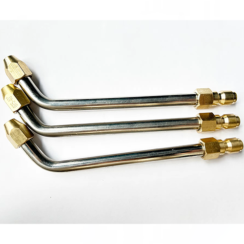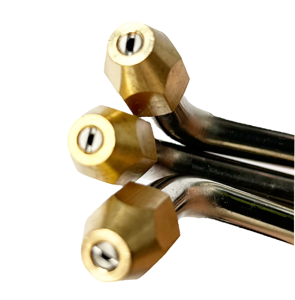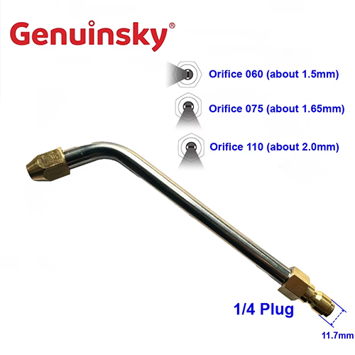 La boquilla de eje doblado es un accesorio de limpieza de alta presión comúnmente utilizado en los tiempos modernos. La abertura de la boquilla del eje curvado generalmente se refiere al diámetro de la boquilla. Su unidad de medición es de 0.01 mm. Hay tres estilos de apertura para elegir. El primero es 060, y el diámetro correspondiente es de aproximadamente 1.51 mm. El segundo es 075, y el diámetro correspondiente es de aproximadamente 1.70 mm. El tercero es 110, y el diámetro correspondiente es de aproximadamente 2.20 mm.