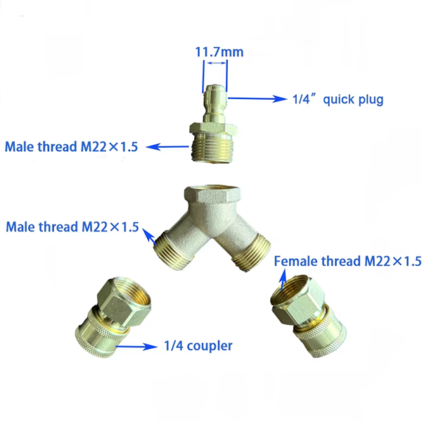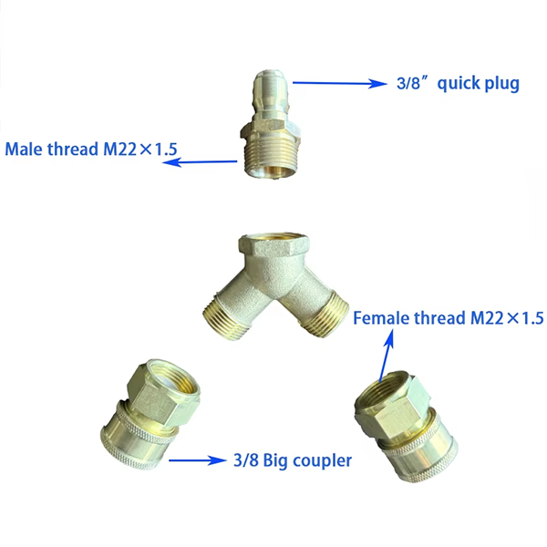 Hay dos modelos, el primero es un conector de tres vías con acopladores de 1/4 "y 2 piezas de 1/4". Un extremo del enchufe de 1/4 "tiene un diseño de enchufe rápido con un diámetro de 11.7 mm, y el otro extremo es el hilo macho M22 × 1.5. Un extremo de los dos acopladores de 1/4" es el hilo femenino M22 × 1.5, y el otro extremo es 1/4 acoplador. El segundo es un conector de tres vías con acopladores de 3/8 "y 2 piezas de 3/8". El material es de cobre completo, que tiene buena resistencia a la corrosión y puede mantener una conexión estable en el entorno complejo del lavado de automóviles. Al mismo tiempo, el cobre también tiene una cierta resistencia y excelente ductilidad, lo cual es una opción confiable para entornos de limpieza de alta presión. El tamaño de 1/4 de pulgada se puede adaptar de manera flexible a las lavadoras de automóviles, pistolas de pulverización y otros equipos. La especificación de 3/8 de pulgada se puede aplicar al uso de un flujo más grande, como la limpieza de vehículos grandes o la limpieza de equipos industriales, lo que mejora significativamente la eficiencia de la limpieza.