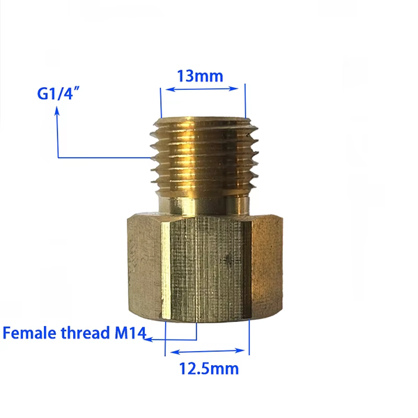 El tamaño del producto en sí está diseñado estrictamente de acuerdo con el tamaño correspondiente. Hay dos especificaciones para elegir. El primer tipo de tetina, un extremo es G1/4 de pulgada, con un diámetro de 13 mm, y el otro extremo es de rosca hembra M14×1,5, con un diámetro de 12,5 mm. El segundo tipo de tetina, un extremo es de rosca macho M14, con un diámetro de 14 mm, y el otro extremo es de rosca hembra M14×1,5, con un diámetro de 12,5 mm, con un diseño de cono interior. El diseño del cono interior puede coincidir estrechamente con la superficie cónica de la junta correspondiente para formar nuevamente un sello secundario, de modo que la estanqueidad y la resistencia a la presión de la conexión se pueden mejorar significativamente. La boquilla cónica de latón M14x1,5 hembra a M14 macho es un material de latón con fuerte resistencia a la corrosión y a la presión. El transporte de fluidos requiere un ambiente húmedo a largo plazo y es propenso a reacciones químicas. Por lo tanto, las características del material de latón pueden mantenerlo estable y no es fácil de oxidar ni romper, lo que afecta todo el flujo de trabajo. También extiende la vida útil del producto en sí y reduce el costo de reemplazo del equipo.