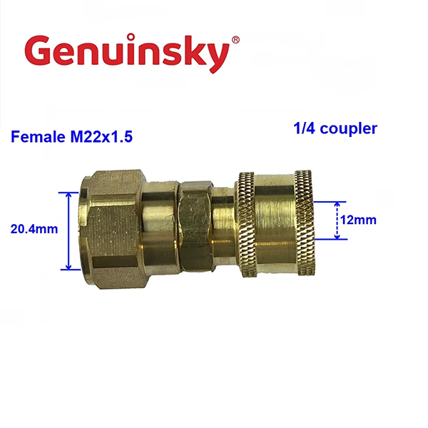 Marca Genuinsky Pareja de 1/4 "res una opción confiable para las operaciones de limpieza. Un extremo del producto es el hilo femenino M22 × 1.5, con un diámetro de 20.4 mm, con un conector rápido de latón de doble toque, 20 SFA, 1/4 de pulgada, que son conectores ampliamente pequeños utilizados para conectar tuberías, cables o interfaces de dispositivos. El material del producto es latón. La ventaja del latón en sí es la resistencia a la corrosión, y también tiene una cierta resistencia y dureza. Por lo tanto, puede adaptarse a escenarios de uso complejos, extender el tiempo de uso de los productos relacionados y reducir la inversión de costos. Hable brevemente sobre las habilidades de uso de 1/4 "acoplador. Antes de la instalación: asegúrese de que la interfaz esté limpia, luego conéctela manualmente, gire el extremo roscado de M22 × 1.5 y conqueje el conector de 1/4 de pulgada en el otro lado directamente en el adaptador y apriete a un estado de sellado estable. Después de usar la atención especial para que el producto sea el producto y el tiempo de uso del producto de la misma conexión, así como el uso de la conexión, así como el uso de la configuración regularmente. Proceso de limpieza y lograr un excelente sellado.