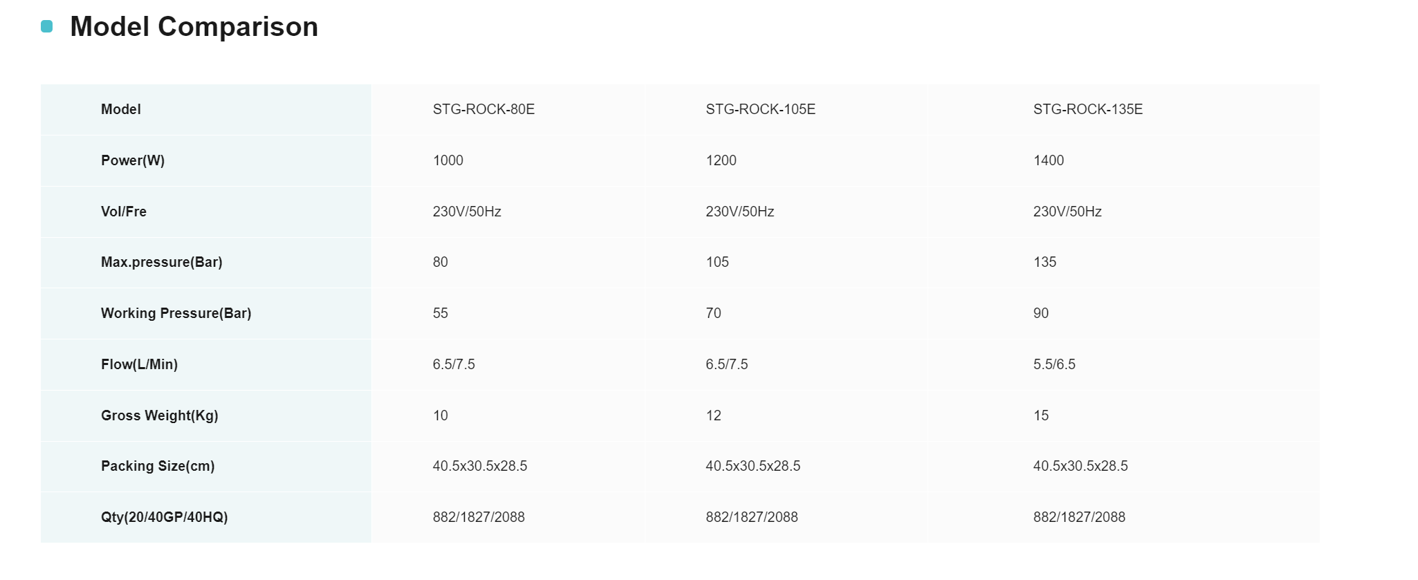 El tercero, STG-ROCK-135E, es un modelo comercial profesional. Con una potencia de 1400W, la presión máxima es de 135Bar, la presión de trabajo es de 90Bar, el caudal es de 5,5/6,5 litros/minuto y el peso de toda la máquina es de 15 kg. La presión y potencia de este modelo es la mayor entre los tres. Con un fuerte rendimiento de alta presión, puede quitar fácilmente las manchas rebeldes del objeto de limpieza. Es muy eficaz para manchas de aceite pesado en talleres industriales, barro en los chasis de vehículos de ingeniería y suciedad rebelde en vallas agrícolas. Es adecuado para escenarios de limpieza intensa, como equipos de limpieza profesionales, talleres de fábricas y granjas.