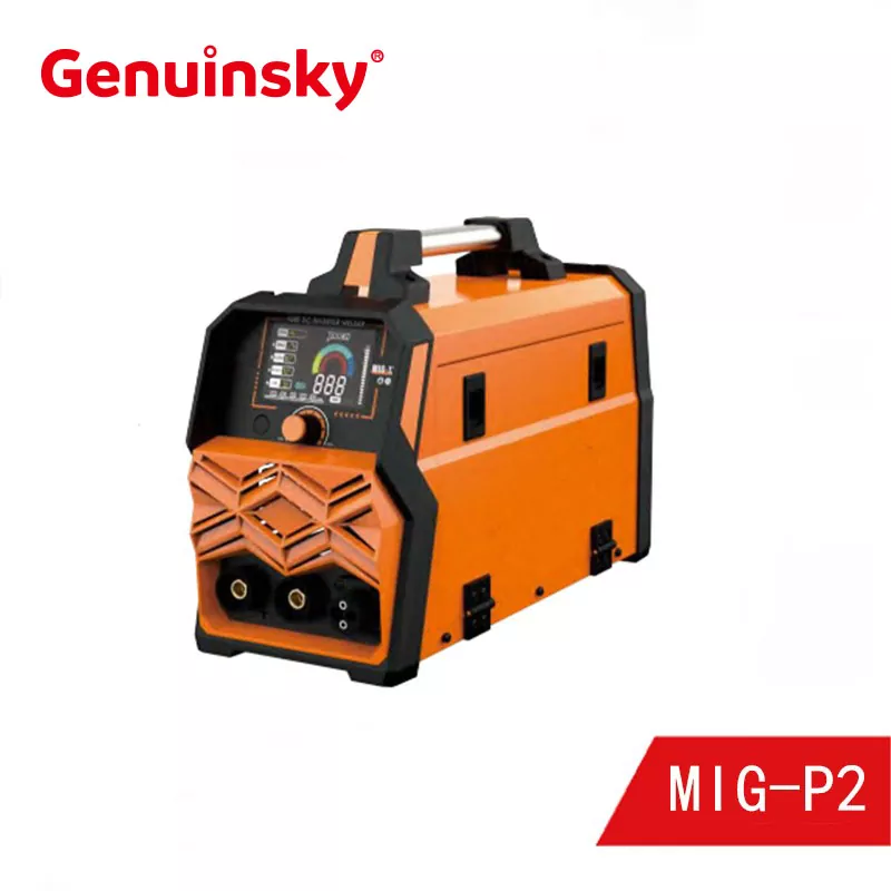 Genuinsky Brand Mig Inverter Welding Machine Gasless LCD P2 Modelo, que es una colección deA MÍ(soldadura protectora de gas polar fundido),MMA(soldadura por arco manual) yTig(soldadura de protección de gas inerte polar de tungsteno soldadura de la protección del inversor con tres funciones, con pantalla de cristal líquido P2.