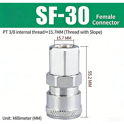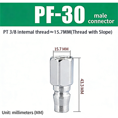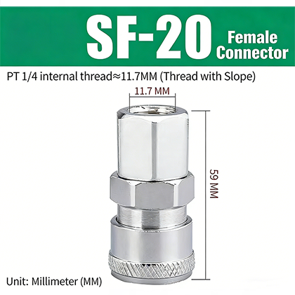 Los acoplamientos rápidos tipo C de la serie PF–SF de Genuinsky con rosca JIS PT cuentan con una estructura de conexión rápida tipo C, que permite emparejar libremente los conectores macho y hembra. La superficie galvanizada y el núcleo de la válvula de cobre mejoran la durabilidad del producto. Como proveedor chino profesional de accesorios para herramientas neumáticas, Genuinsky fabrica sus productos cumpliendo plenamente con la estandarización. Esta serie ofrece una gama completa de especificaciones, lo que permite una combinación precisa con diferentes tuberías neumáticas.