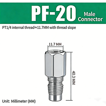1.PF-20. Rosca de tubo 1/4, con pendiente de rosca, el diámetro de la parte de la rosca es de aproximadamente 11,7 mm y la longitud total del producto es de 40,3 mm.