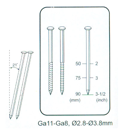 Las especificaciones de las uñas son GA11-GA8, con un diámetro de 2.8-3.8 mm y longitudes típicamente de 50 mm, 75 mm y 90 mm (2 pulgadas, 3 pulgadas, 3-1/2 pulgadas). El ángulo de inclinación de la disposición de las uñas es de 21 grados. La profundidad de la uña se puede ajustar según las necesidades laborales.