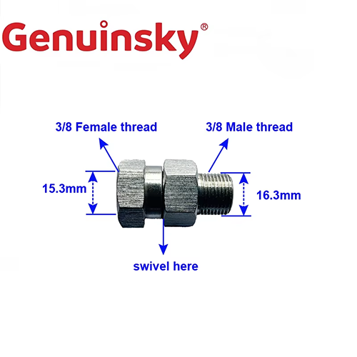 Este accesorio giratorio de acero inoxidable es de 3/8 de hilo femenino en un extremo, con un diámetro de aproximadamente 15.3 mm y 3/8 de hilo masculino en el otro extremo, con un diámetro de aproximadamente 16.3 mm. En particular, la parte media se puede girar. Esta característica se puede adaptar a la manguera de alta presión y en rociar la pistola de equipos de lavado de automóviles. En la operación de limpieza, se pueden ajustar varios ángulos de acuerdo con el uso, lo que puede resolver el problema de la distorsión de la tubería. Con la estructura de rotación, se puede realizar una conexión flexible.