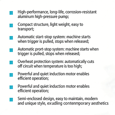 La ventaja importante de la lavadora de alta presión portátil STG-ROCK-L es que es portátil. El peso bruto de toda la máquina es de sólo 7 kilogramos y también hay un diseño de mango integrado, que puede ser levantado y movido fácilmente incluso por usuarios con menos fuerza. El tamaño total del embalaje es de 40,5×21×31 cm, lo que significa que el producto no ocupa todo el espacio del hogar y se puede almacenar fácilmente. Aunque tiene la ventaja principal de la portabilidad, el rendimiento principal del dispositivo no es malo. En primer lugar, el producto en sí tiene un motor de inducción de 650 vatios, que admite un voltaje de 230 V/50 Hz. La presión máxima de trabajo puede alcanzar los 50 bar y la presión de trabajo es básicamente estable en 35 bar. En segundo lugar, con un flujo de salida de 5,5 a 6,5 litros/minuto, puede eliminar fácilmente las manchas de los automóviles, el polvo de las paredes o los muebles y puede lograr una limpieza eficiente. Finalmente, el diseño general de la lavadora de alta presión portátil STG-ROCK-L también ha mejorado aún más la seguridad y la durabilidad. El equipo adopta una bomba de alta presión de aluminio resistente a la corrosión de alto rendimiento, que también resiste entornos de trabajo complejos húmedos y polvorientos. Puede mantener la estabilidad y no es fácil de oxidar ni romper, por lo que el equipo puede funcionar de manera estable y continua durante mucho tiempo. Equipado con un sistema de arranque y parada automático, puede apretar el gatillo durante la operación para completar el trabajo de arranque y soltar el gatillo para completar el trabajo de parada, lo que puede evitar el consumo de energía en ralentí. Al mismo tiempo, también se instala en el interior un dispositivo de protección contra sobrecalentamiento. Cuando la temperatura es demasiado alta durante el funcionamiento, la energía se puede cortar automáticamente, lo que garantiza la seguridad de los usuarios y evita accidentes. La ocurrencia de la situación. Al mismo tiempo, el diseño semicerrado del fuselaje también es muy humanizado, lo que resulta conveniente para el mantenimiento diario y permite comprobar las piezas y limpiar el filtro fácilmente.
