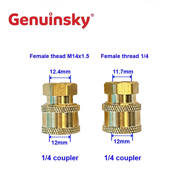 Este producto es un acoplador de liberación rápida de dos latones de dos táctil 20 SFA 1/4 ". El adaptador de Chuck. Hay dos modelos, uno es el hilo interno M14 × 1.5, con un diámetro de 12.4 mm, y el otro es el rosca interna G1/4 pulgadas, con un diámetro de 11.7 mm. Se combinan con mangueras de lavado. Accesorios importantes para la limpieza del automóvil.